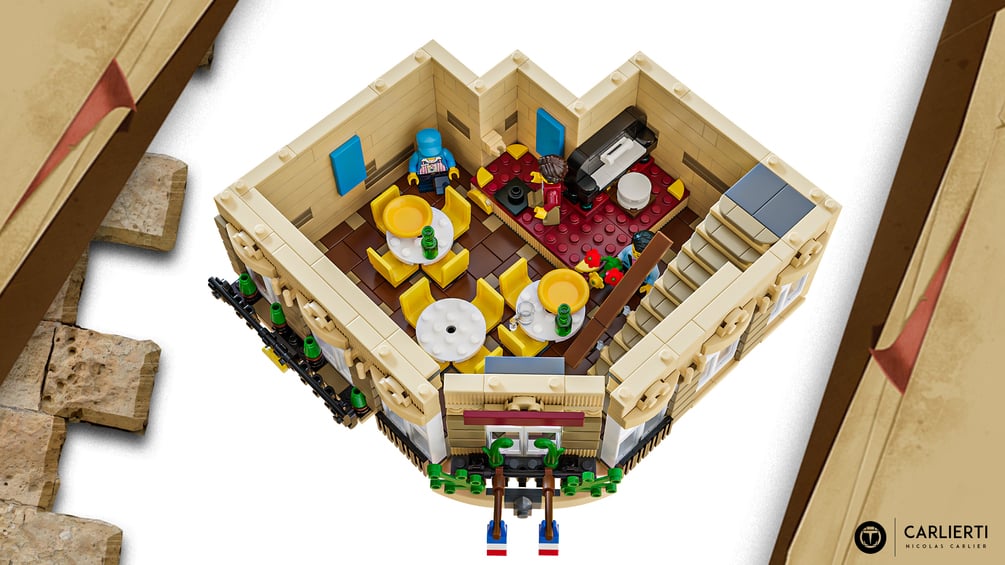 On the ground floor, you find the main dining room, with the kitchen and terrasse. On the second floor, there is a second dining room containing an estrade for musicians. On the last floor, there is a typical Parisian apartment. The entire build completes the other lego modular and can be a great addition in your lego city.