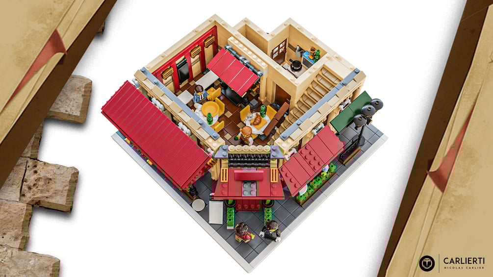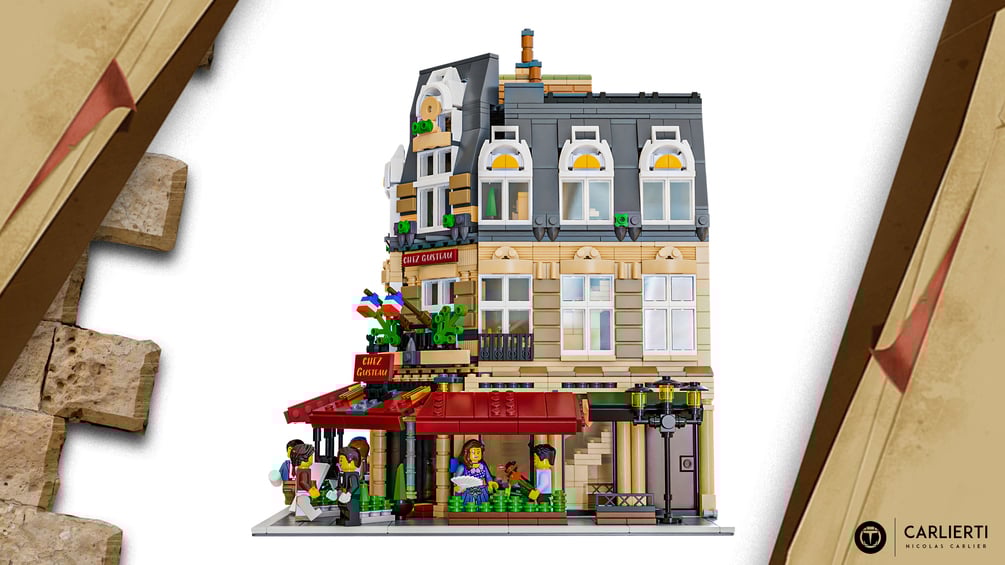 On the ground floor, you find the main dining room, with the kitchen and terrasse. On the second floor, there is a second dining room containing an estrade for musicians. On the last floor, there is a typical Parisian apartment. The entire build completes the other lego modular and can be a great addition in your lego city.